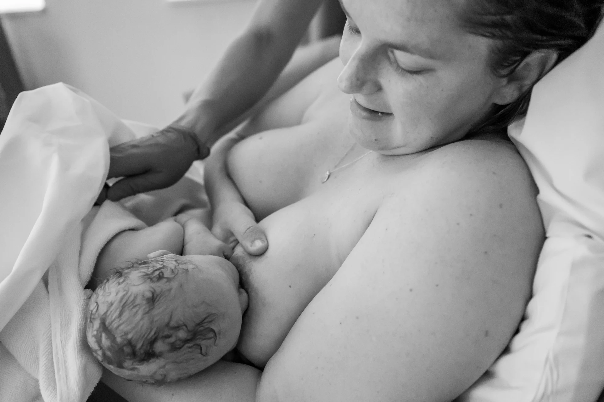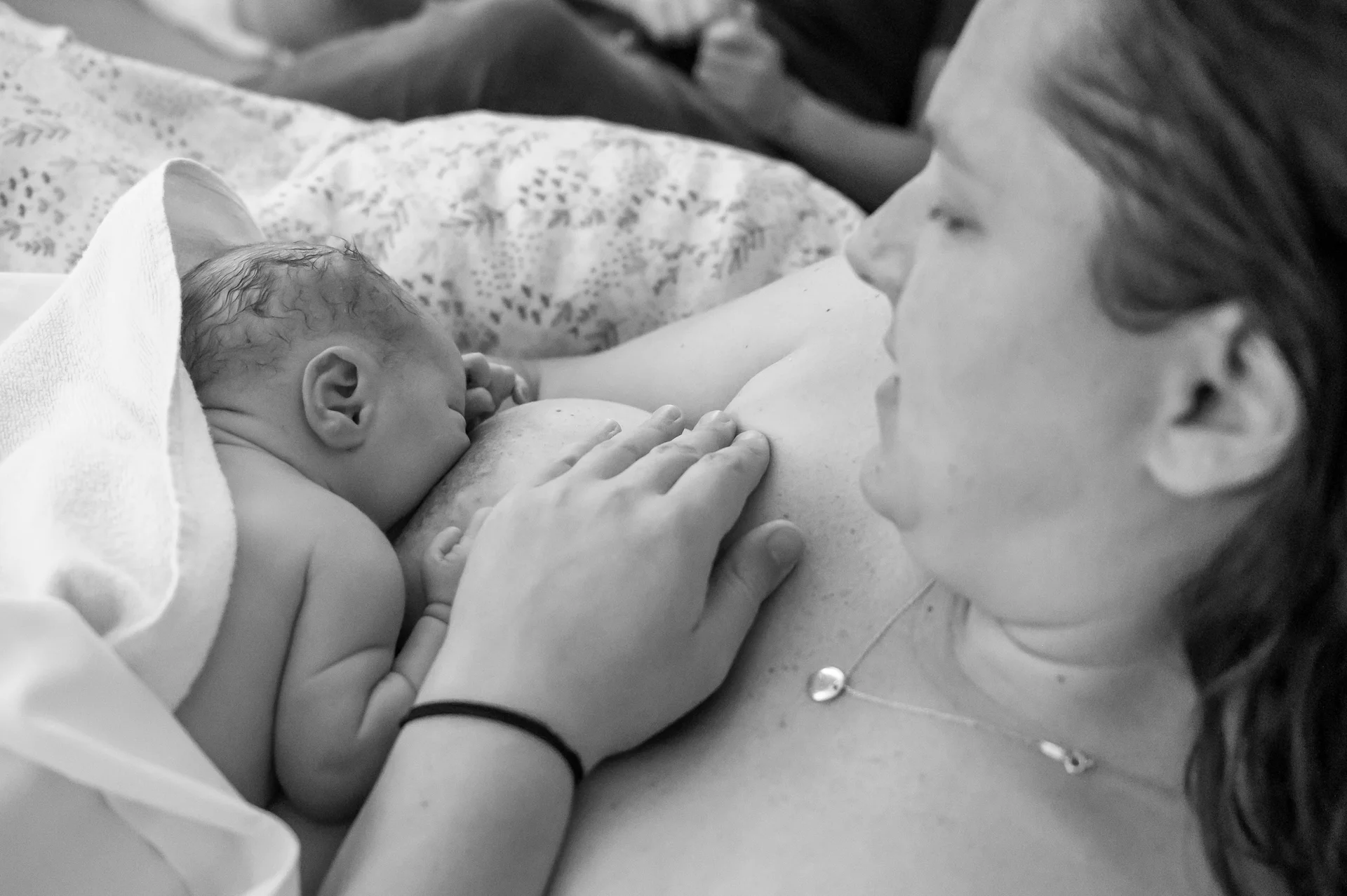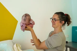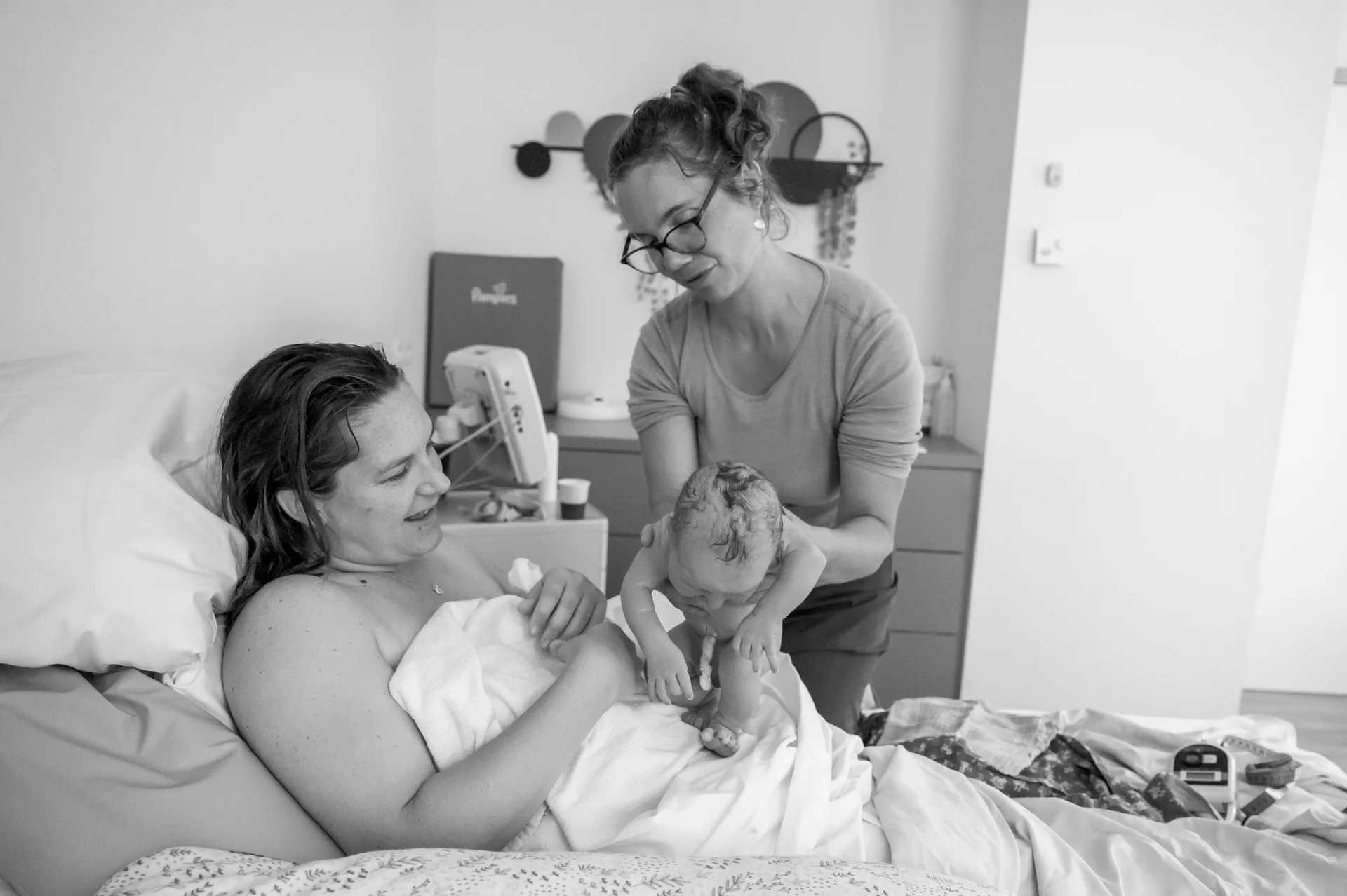 vragende blik richting de vroedvrouw om te kijken of alles goed
