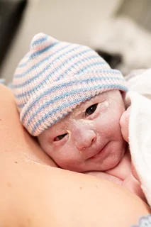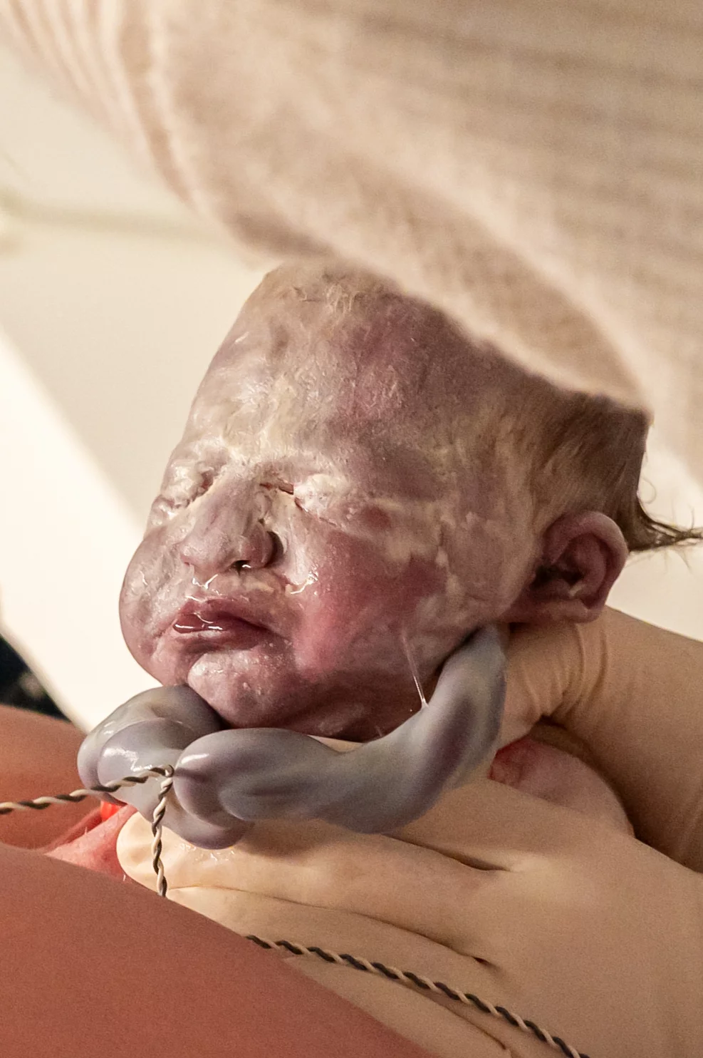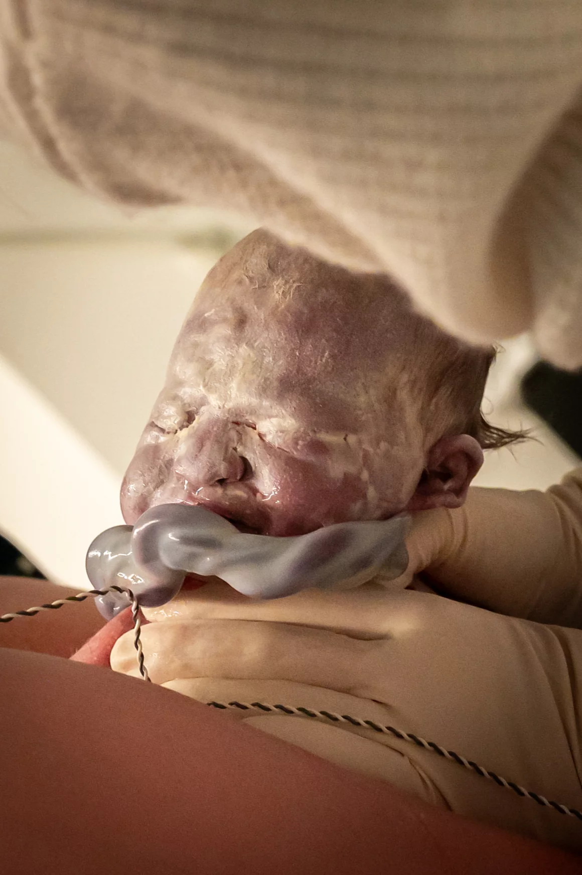 Helaas moet ze hiervoor naar OK en moet papa wachten op de gang. Gezien de snelheid waarop de weeën zich opvolgde is papa even ongerust dat mama daar zal bevallen zonder hem. Maar gelukkig is ze snel terug... Daarna valt alles een beetje stil en heeft mama even de tijd om wat tot rust te komen en wat te slapen. Papa maakt van de gelegenheid gebruik om snel wat te eten. Enkele uren later voelt mama toch weer veel druk en mag ze beginnen persen. Elke wee zie je het hoofdje goed opschuiven. Wat een kracht heeft mama! Na ongeveer een half uurtje persen is het eindelijk zover, om 22.41 u wordt je geboren en je laat meteen luidkeels horen dat alles goed met je gaat! Wat een mooie start op deze wereld!