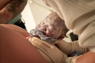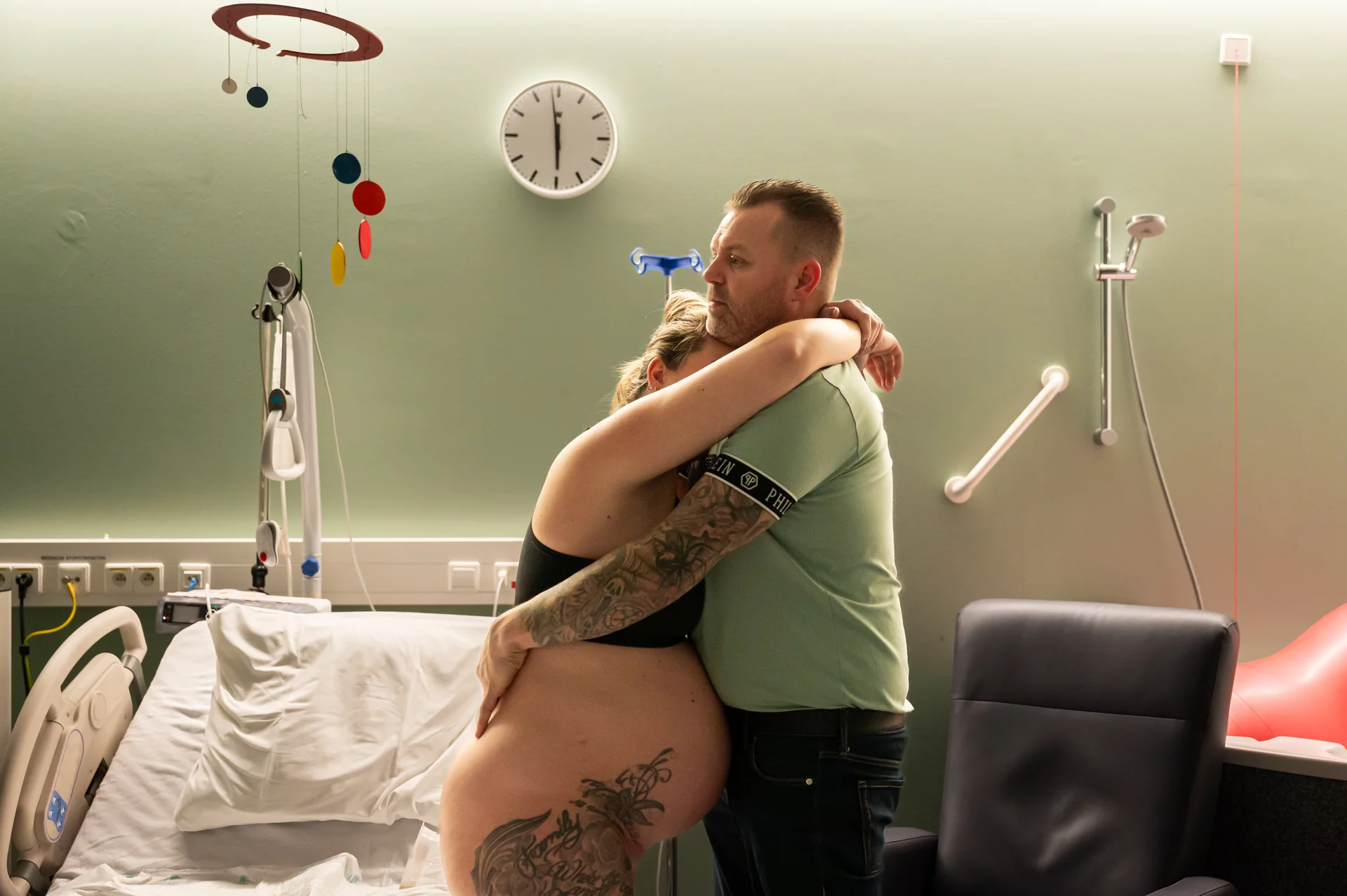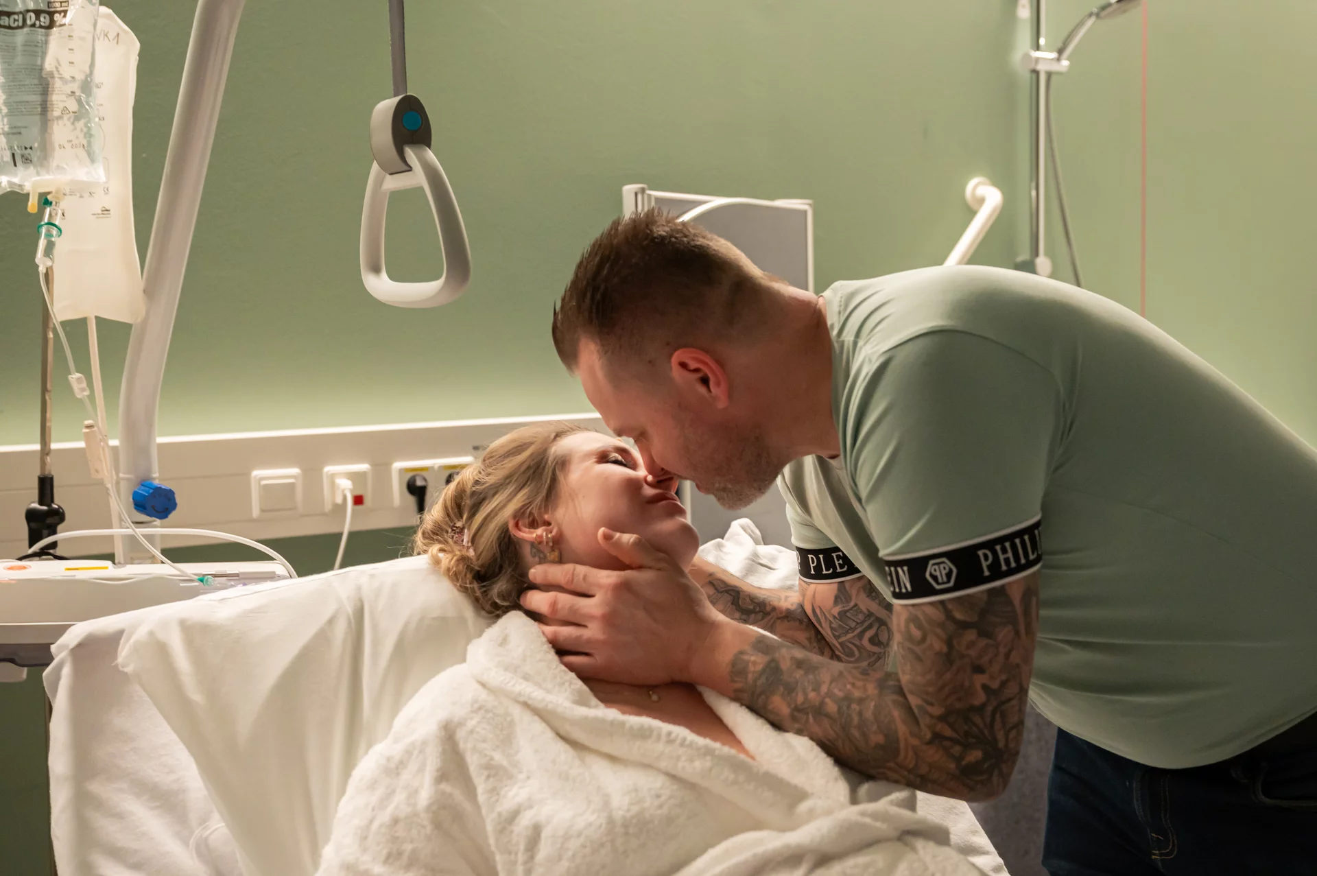 In het ziekenhuis wordt mama eerst aan de monitor gehangen en blijkt bij controle dat ze al 5 cm heeft. De weeën volgen elkaar snel op en mama heeft amper tijd om te bekomen. Om 18.15 staat ze recht van de monitor en breekt haar water. Dit zorgt ervoor dat de weeënstorm nog feller wordt en mama hierdoor ook weer ziek wordt van de weeën. Om even te ontspannen gaat mama in bad in de hoop daar de weeën beter te kunnen opvangen maar ze voelt al na 10 minuten druk. Ze controleren opnieuw en blijkt dat ze al dik 9 cm heeft. Omdat het laatste stukje misschien toch nog een tijdje kan duren besluit ze dat ze een epidurale verdoving wil om in alle rust het laatste stukje arbeid te kunnen doen en hun kindje te verwelkomen.